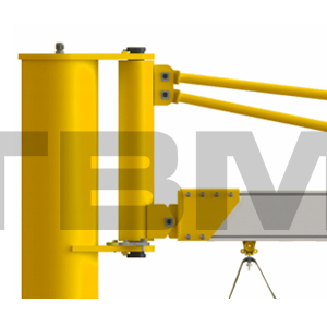 | Osa otáčení otočného jeřábu 270° je umístěna na dvou okách nad sloupem. Mezi horním a spodním okem a osou otáčení jsou instalována rovinná nosná ložiska a samomazná měděná pouzdra. To zajišťuje flexibilní otáčení a tlumí setrvačný výkyv výložníku, když se zastaví. Externí limity úhlu natočení jsou k dispozici pro nastavení úhlu natočení výložníku. |