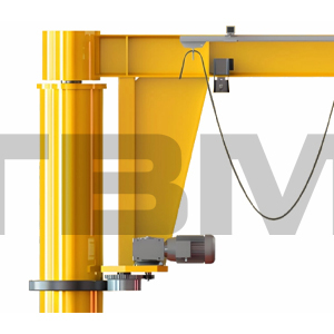 | Osa otáčení otočného jeřábu o 360° je umístěna přímo na kruhové trubce konzolového jeřábu, soustředně se sloupem. Napájení je dodáváno přes 360° kolektorový kroužek, který umožňuje neomezené otáčení o 360 stupňů. Externí limity otáčení lze také použít k nastavení úhlu natočení výložníku. |